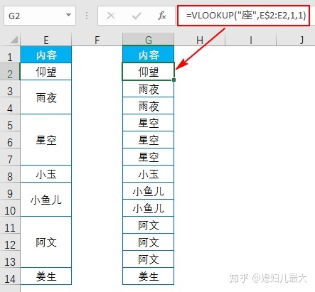 比如D5单元格公式=VLOOKUP(VLOOKUP("座",A$2:A5,1,1),F:G,2,0)