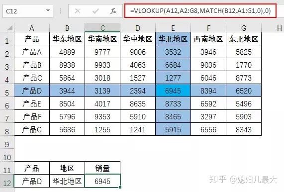 MATCH(B12,A1:G1,0)部分找到B12单元格内容“华北地区”在区域A1:G1中的位置5,把它作为VLOOKUP函数的第3参数;
