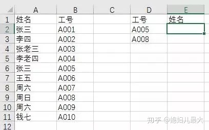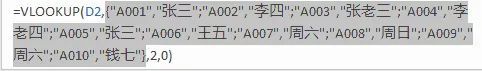 =VLOOKUP(D2,IF({1,0},B2:B11,A2:A11),2,0)