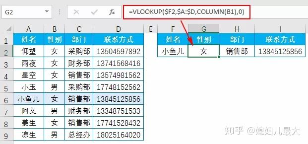 =VLOOKUP($F2,$A:$D,COLUMN(B1),0),右拉填充