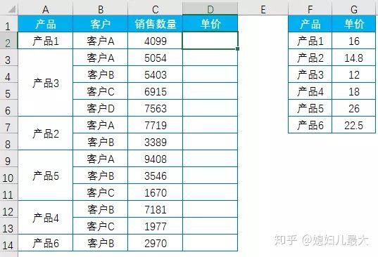 即D5单元格公式就是=VLOOKUP("产品3",F:G,2,0),返回单价12