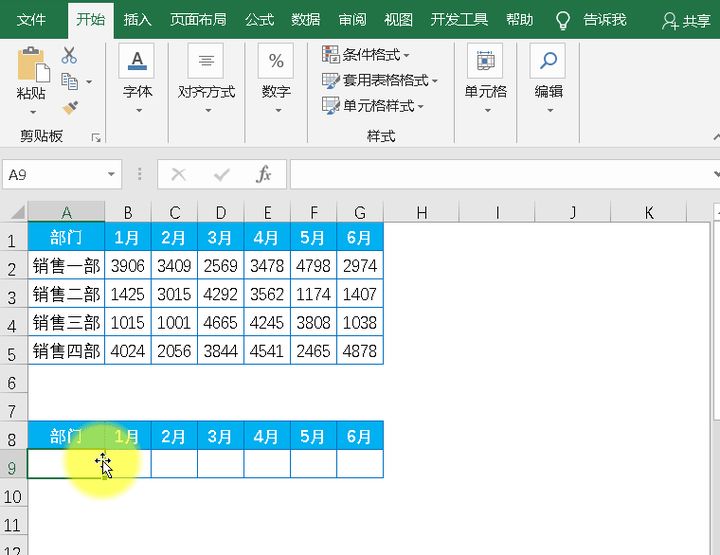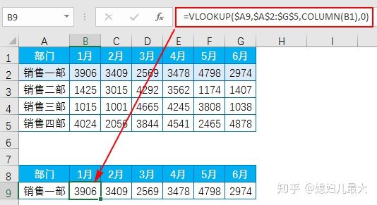 =VLOOKUP($A9,$A$2:$G$5,COLUMN(B1),0) ,右拉填充