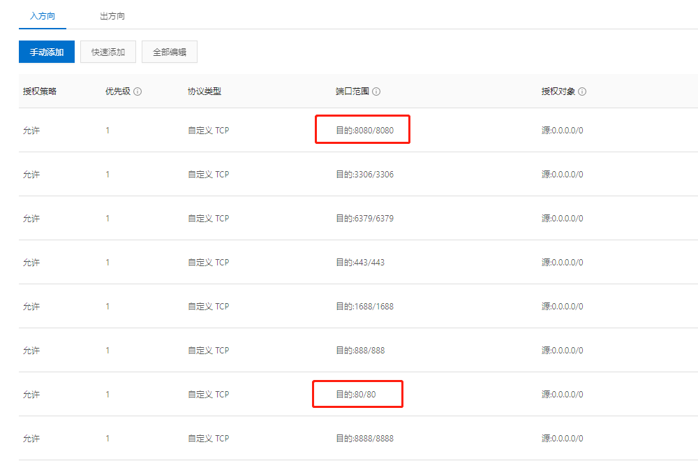 操作:实例列表页面,点击-更多-网络和安全组】-【安全组配置】-【配置规则】,添加【8080/8080】和【80/80】端口,授权对象:0.0.0.0/0。